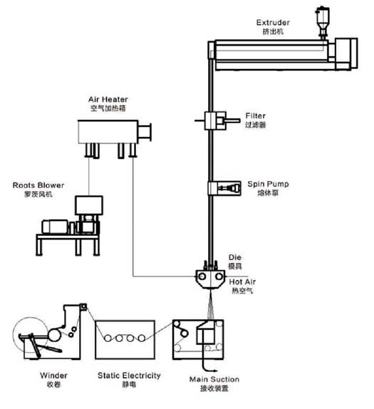 漢諾工業(yè)泵HNP熔體計(jì)量泵為國內(nèi)熔噴無紡布生產(chǎn)企業(yè)提供優(yōu)質(zhì)的計(jì)量、過濾設(shè)備。熔噴布生產(chǎn)工藝流程:原材料---->熔融擠出---->過濾---->計(jì)量(HNP熔噴布計(jì)量泵)---->空氣加熱壓縮---->熔噴---->成網(wǎng)---->收卷。