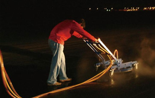 機場跑道因飛機起落,輪子與道面的急劇摩擦使橡膠粘在道面上,久而久之,粗糙的道面就變得很光滑,這樣飛機就容易滑出跑道。定期除膠保證道面摩擦系數(shù)大于0.5,所采用的就是超高壓水射流技術(shù),其基本要求就是既要除去橡膠,又要不傷跑道。以往采用人工刷洗和化學(xué)清洗的方法,但效果并不理想成本高、易污染,不適應(yīng)瀝青道面等缺點。國內(nèi)外機場都在普遍應(yīng)用水射流進行除膠作業(yè)。漢諾所提供的高壓泵機組配合清洗手推車可以高效地解決以上問題。